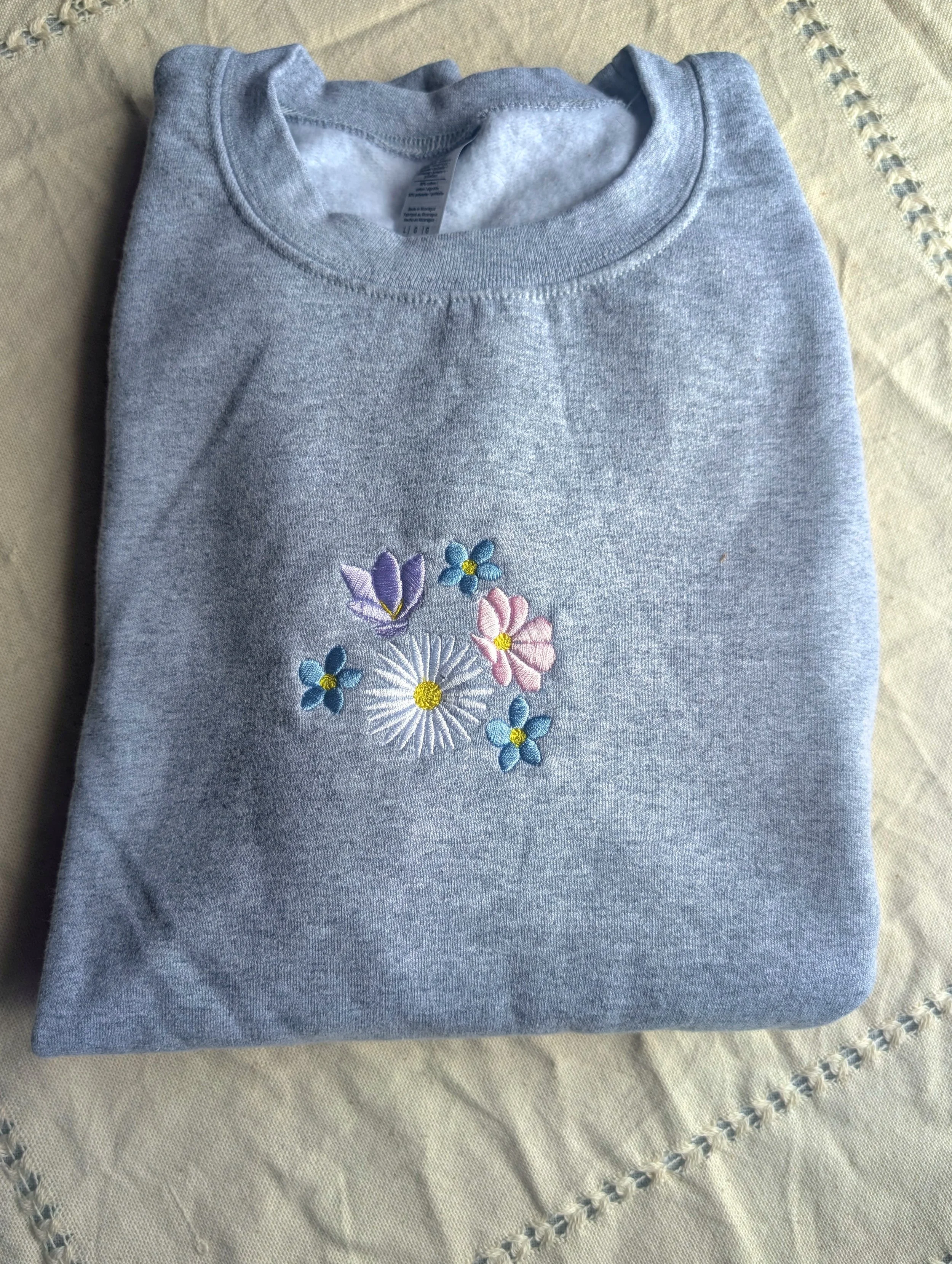 A sweatshirt we tried out, and after stitching out didn’t continue with it. Size Large, Sport Gray.