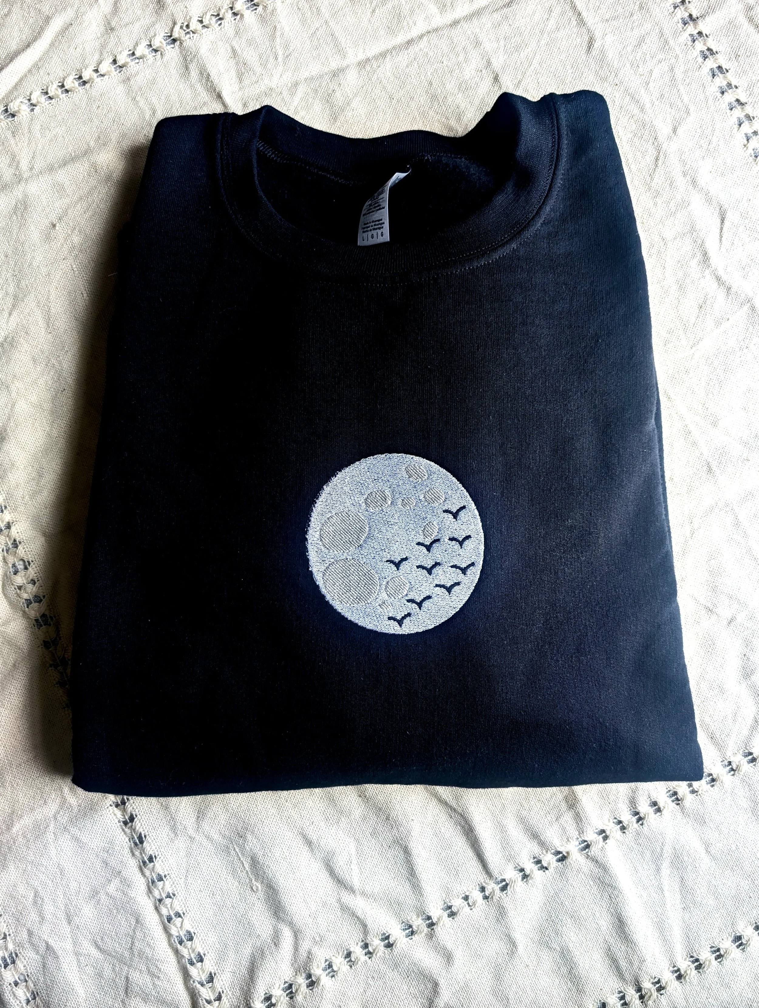 This Bat Moon Sweatshirt is our first prototype of the design. Its completely the same, except the moon colors are what we originally tried out, and we went with a different color for the later version. This sweatshirt is a size large.