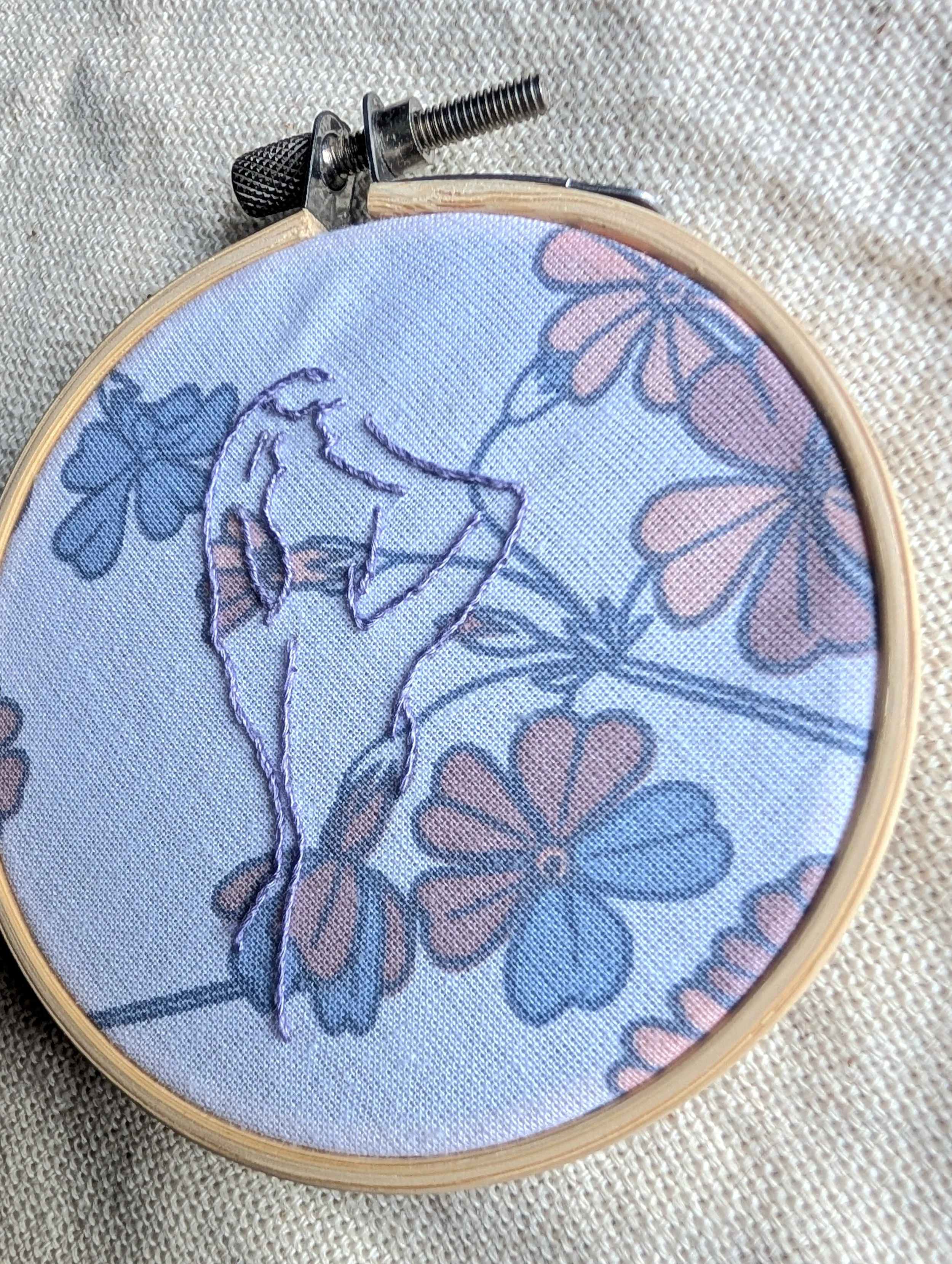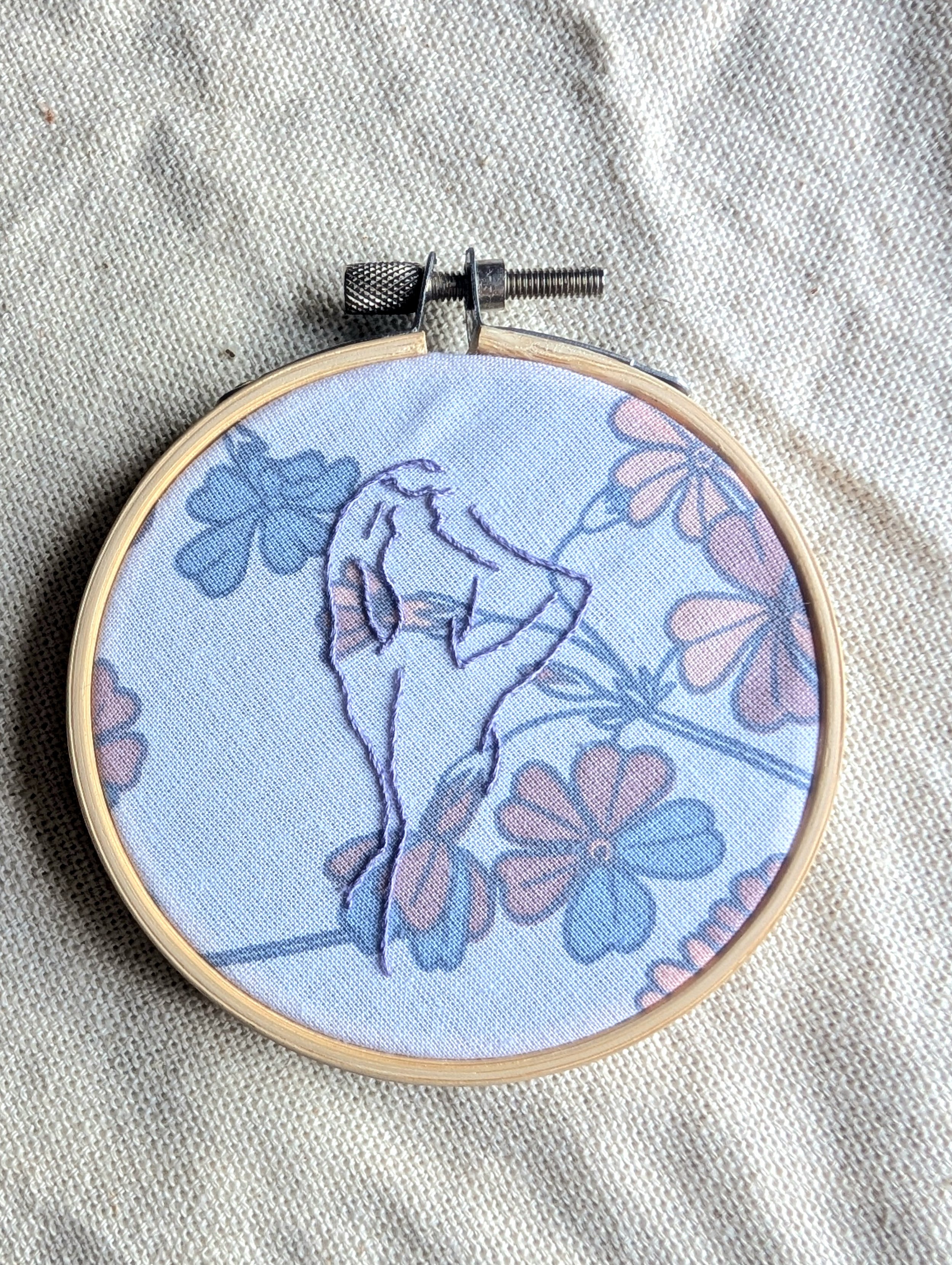 This embroidery is made with cotton fabric, cotton DMC floss, and finished in a 3 inch wooden hoop. The back is lined with felt.